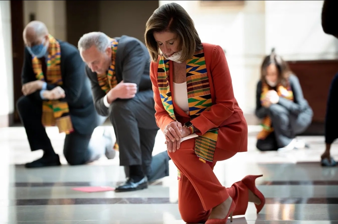 Pelosi was an advocate for the Affordable Care Act (Obamacare), abortion, and LGBTQ rights. She was one of the first politicians pictured kneeling for the flag next to her fellow democrat constituents.
