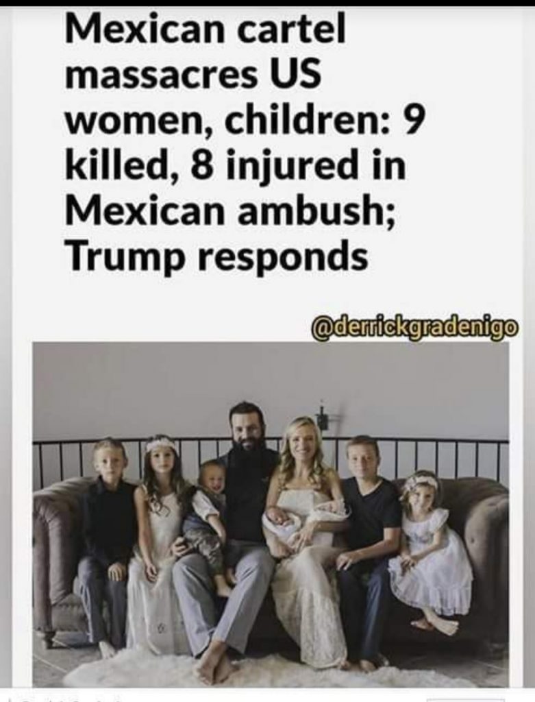 Mexico officials said that “3 women and 6 children were slaughtered by cartel gunman and one child is still missing in northern Mexico. Relatives say the victims are U.S. Citizens.”