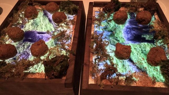 The iPads are decorated with moss and other vegetation, and morsels are scattered throughout the platters. Overall, this earthly decor makes the electronic platter seem organic and telluric.